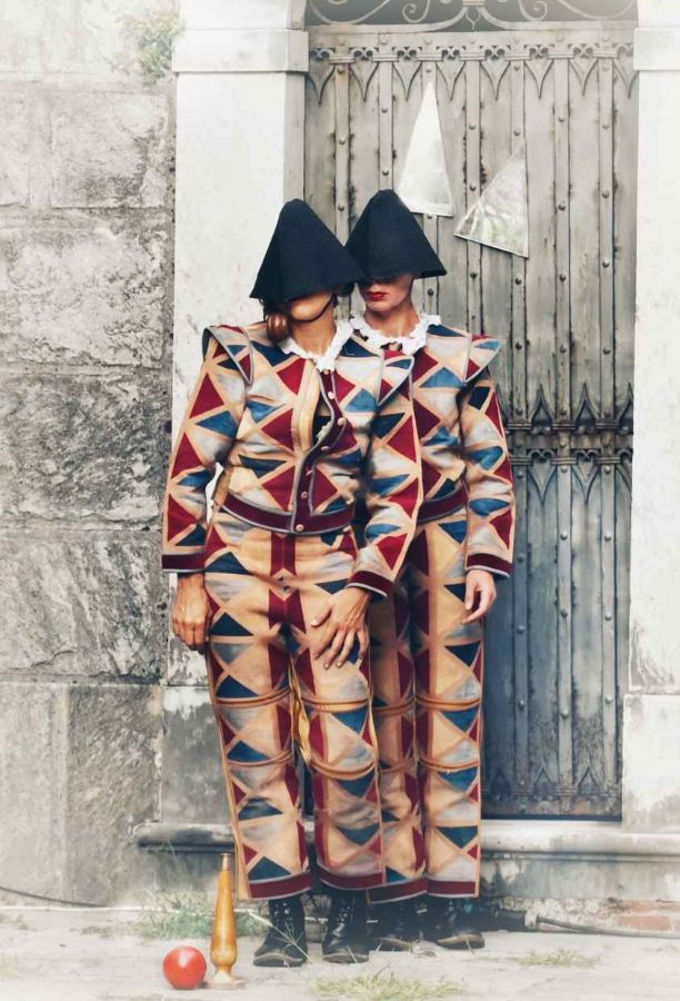 Un mito orfico narra che Dioniso fanciullo è attirato dai Titani con vari giocattoli, fra cui uno specchio: e proprio mentre contempla l'immagine che lo specchio gli rimanda, i Titani lo sbranano. Ci è venuto naturale collegare il mito al dipinto di Picasso: Arlecchino allo specchio cosa vede? Noi abbiamo immaginato che, come Dioniso, veda il Mondo! la sua totalità frantumata, gli uomini, le cose, noi...